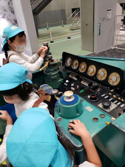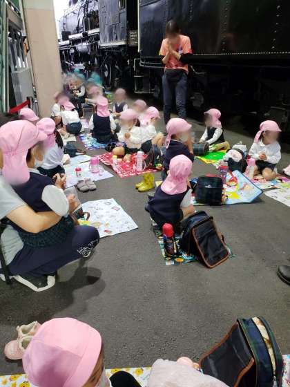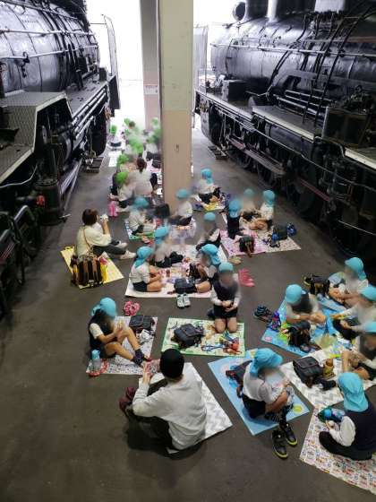 大きな蒸気機関車を見ながらお弁当を食べました。