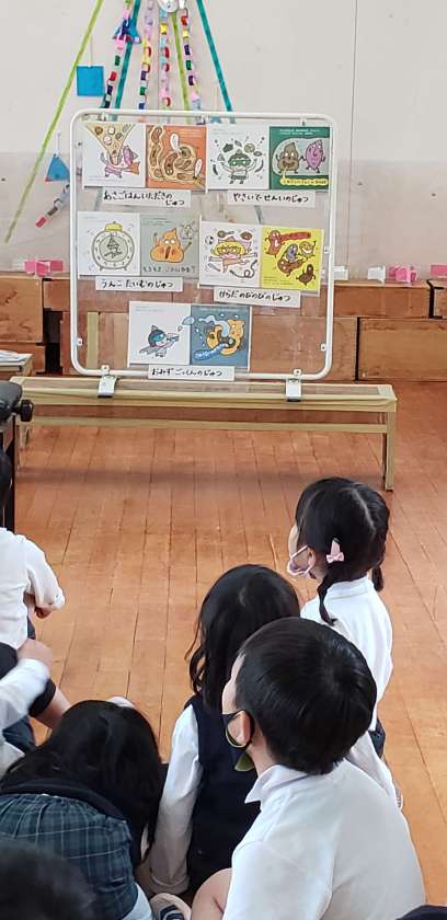 今月は「うんこダスマンになろう」というテーマで、絵本を読んでもらい、いいうんこが毎日出るために必要なことを教えてもらいました。