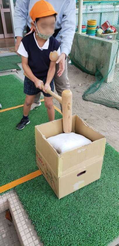 5歳児は自分達で買ってきた餅米です。「水が白くなった」「お餅のにおいがする」