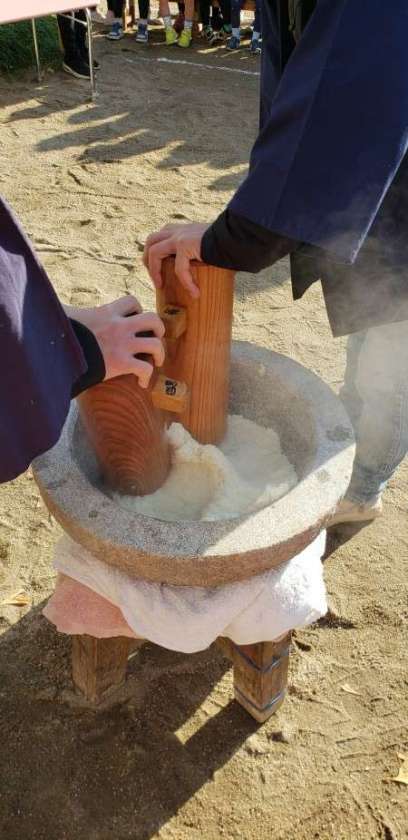 みんなで洗った餅米がせいろのなかで、ほかほかの湯気をたて蒸しあがったところや、お父さんたちがつくとだんだんお餅になっていく様子に歓声があがりました。