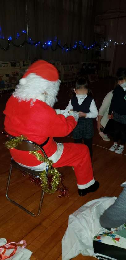 「どうしてよい子の住所がわかるんですか?」「トナカイさんはどうして空をとべるの?」等サンタさんに質問したり、歌を聞いてもらい拍手をしてもらったり、プレゼントももらいました。