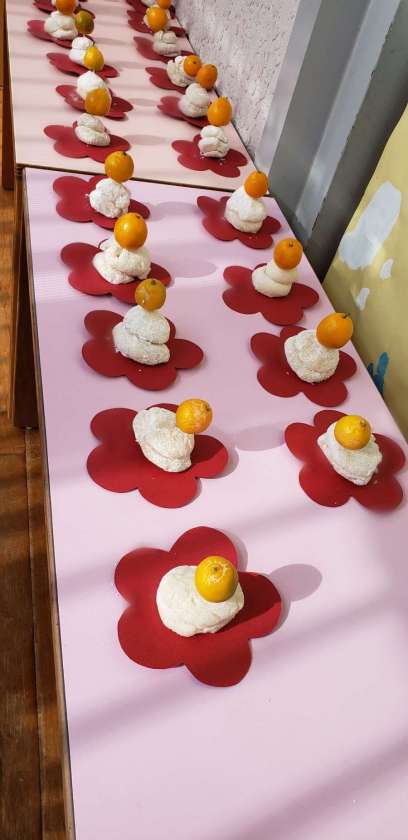 自分で作った鏡餅を飾りました。園庭の橘ミカンものせています。