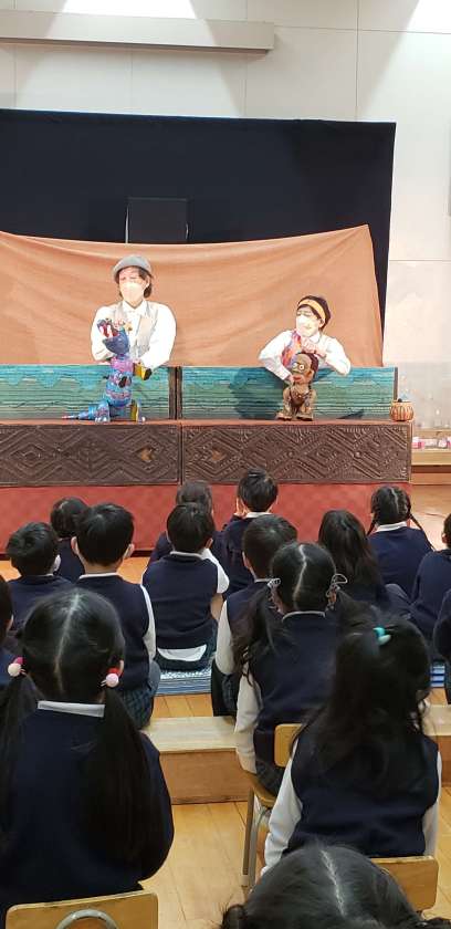 新年のご挨拶と始業式の後は、人形劇団クラルテによる人形劇。アフリカが舞台のお話で、動物たちのおもしろい動きやリズミカルな音楽に、時には笑ったり体を揺らしたりしながら楽しみました。