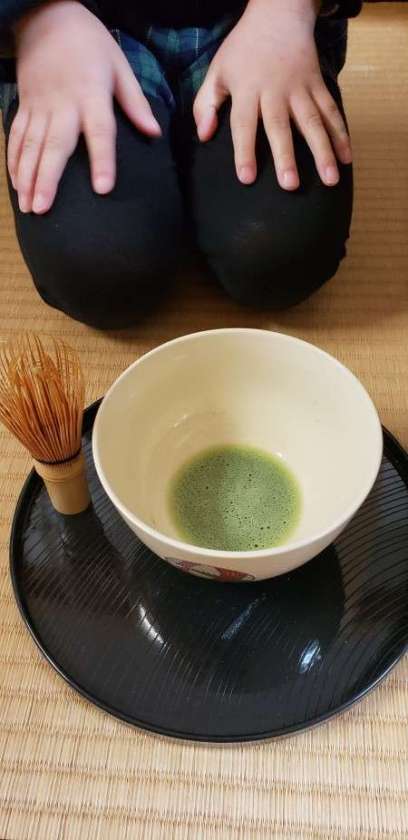 今回、初めて自分でお茶を点てました。一生懸命、茶せんを動かします。きれいな泡がたっている子どももいました。