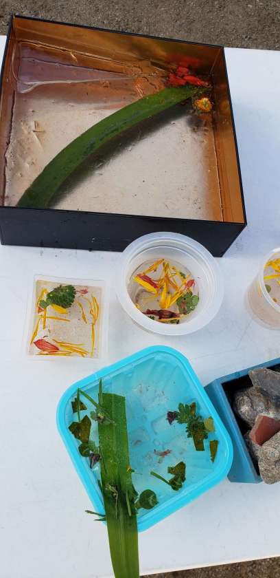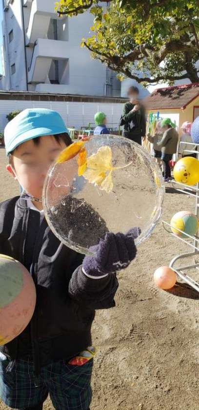 子どもたちは、昨日から仕込んでおいた器に氷がはっているのを見つけたり、川(池)の氷を集めたりと、大喜びでした。