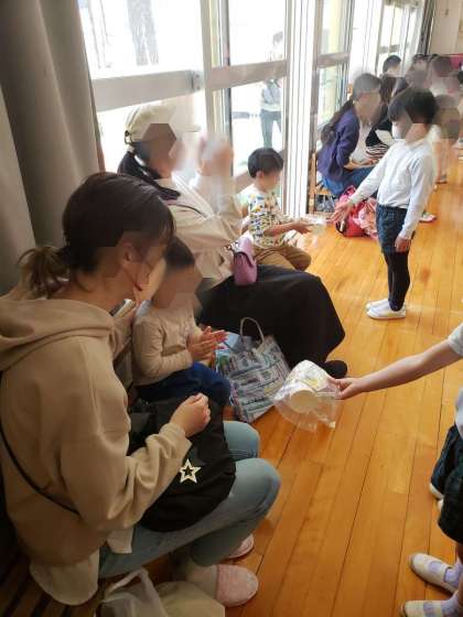 そのあとは、遊戯室で4歳児が歌を歌ったり、優しく手をつないで一緒に踊ったりしました。手作りのプレゼントを「4月待ってるよ」「一緒に遊ぼうね」と渡しました。