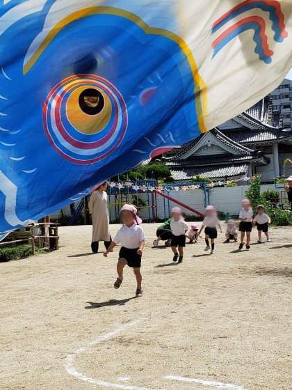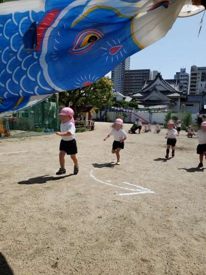 3歳児は、大きなこいのぼりに向かって「よーい どん!」 元気に走りました。