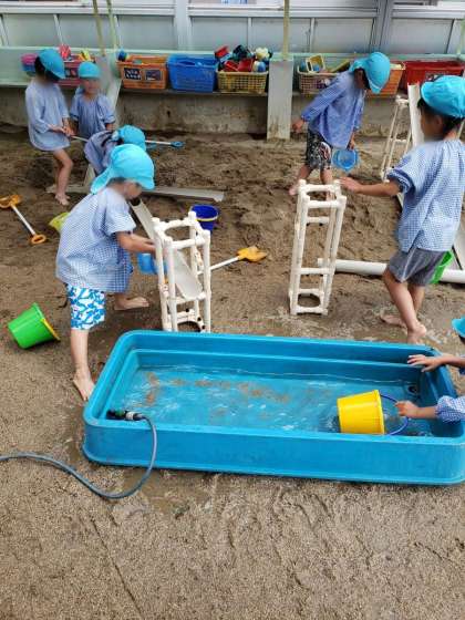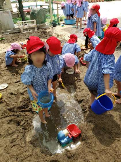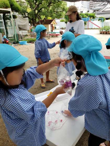 5歳児は、庭のアジサイの花を袋に入れて美しさを感じたり揉むと色が出てくることに気づいたりする姿がありました。砂場では、違う学年も混じりあい泥んこ遊びを楽しんでいます。