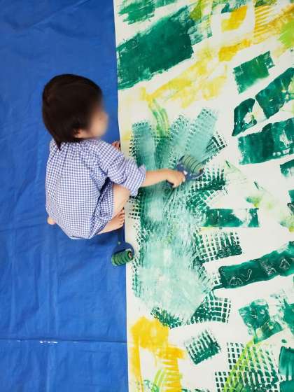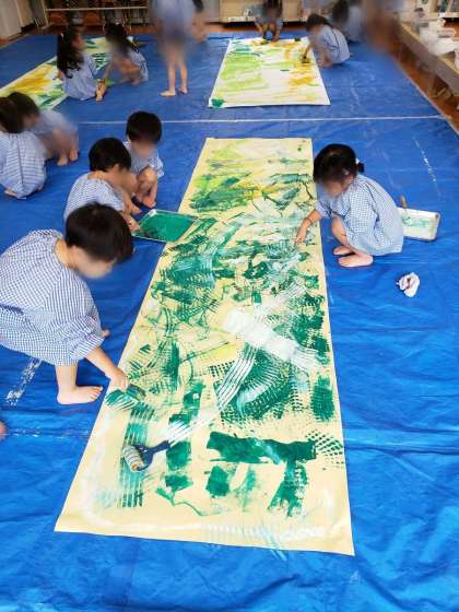 広いお部屋いっぱいの大きな紙。ローラーで全身を使い、のびのびと絵の具遊びをしました。手に絵の具をつけ手型をペッタンする子どももいました。