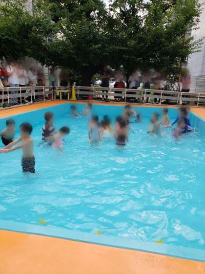 しっかりと準備体操をしているところやシャワーをあびているところ、プールのなかでは、先生の「壁ペッタンして」で、ちゃんと指示を聞き、カエルさんやワニさん、お魚さんになって楽しく遊んでいるところを参観してもらいました。