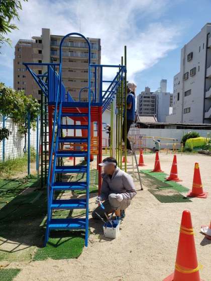 幼稚園のお庭のジャングルジムやすべりだい、うんていがピカピカきれいになりました。