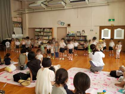 園庭で遊んだあとは、3歳児のお友達が歌を歌ってくれたり、一緒にダンスを踊ったりしました。