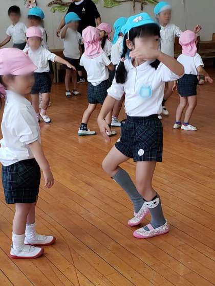 憧れの大きい組さんの演技を教えてもらい一緒に踊ったり、楽しかった経験を絵の具をつかい画面いっぱいに表現したりしています。