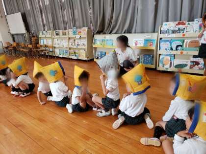また、12日は、Jアラートの避難訓練を実施しました。3歳児も繰り返し様々な想定の避難訓練をすることで、落ち着いて行動できるようになっています。写真は4歳児です。