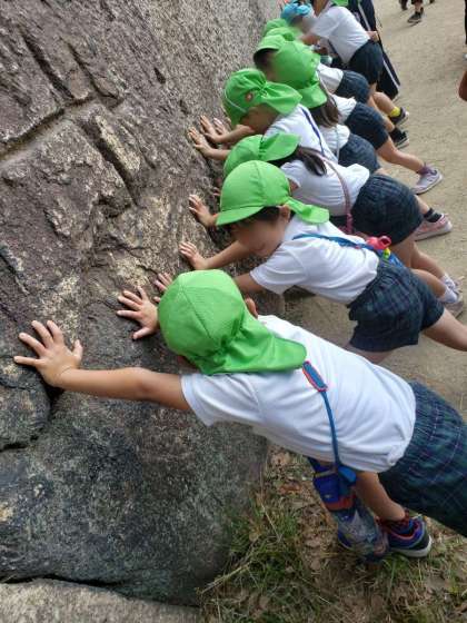 石垣の巨大石に触れ「どうやって運んできたんだろう」「押してみよう」好奇心いっぱいでした。
