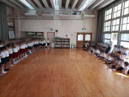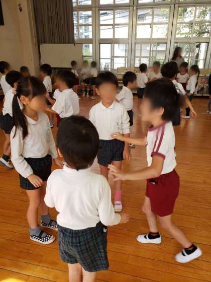 はじめに遊戯室で一緒に歌を歌いました。50名以上の歌声が響きわたり、大勢の友達と気持ちを合わせて歌う心地よさを味わうことができました。