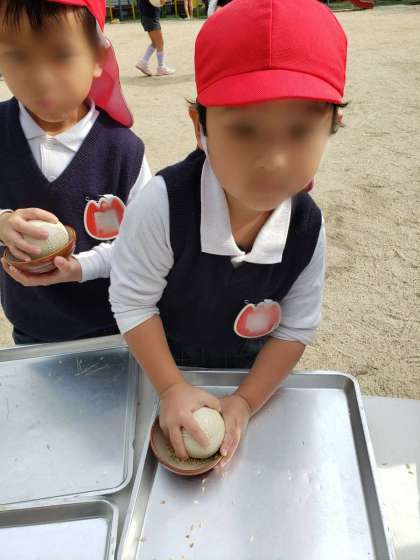 先月、幼稚園の庭で育てた稲が実り稲刈りをしました。
