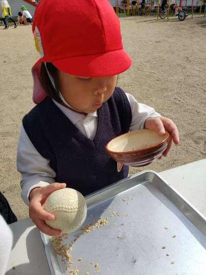 かなり根気よくしないといけません。「あ!お米が出てきた!」と大喜び。いつも食べているご飯がこのようにできることを実感します。1粒1粒大事にする気持ちをもってほしいですね。