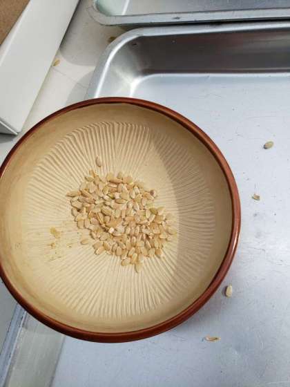 よく乾かしたあと、稲穂からお米をはずし、すり鉢と野球ボールでゴリゴリこすります。はずれた籾殻(もみがら)をふうーーっと吹くと籾殻が飛んで白い玄米が出てきます。