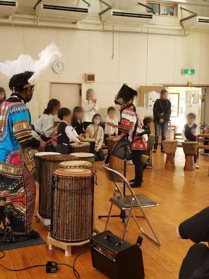 演奏は河辺知美さんとJoseph Nkosi さん。ジェンベの心地よいリズムを感じて園児も保護者も心を解放しとても楽しい時間を過ごしました。実際に太鼓をたたく体験もでき、全身でリズムを感じ楽しんでいました。