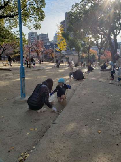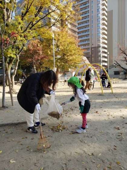 5歳児とその家族で一緒に公園のお掃除をしました。いつもお掃除してくださっている地域の方にもお礼の言葉を言うことができました。落ち葉やゴミを集めて、大好きな公園がきれいになりました。