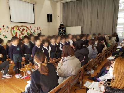 今日は2学期終業式。全園児と保護者が遊戯室に集まりました。