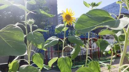 子どもたちが、種から植えて育ててきたヒマワリ。お日様に向かって元気に咲きました!