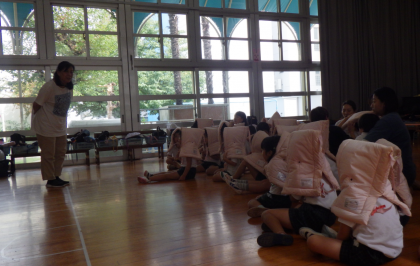 預かり保育で地震を想定した避難訓練をしました。子どもたちは、机の下でダンゴムシのポーズをして、しっかりと頭を守っていました。遊戯室の防災頭巾をかぶって、素早く先生の近くに集まることができていましたよ。