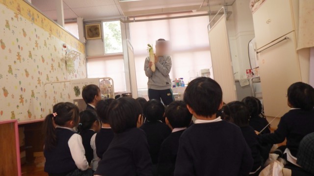 12月の保健指導は、子どもたちの野菜への興味関心を高めるために、本物の野菜を使用してクイズを行いました。