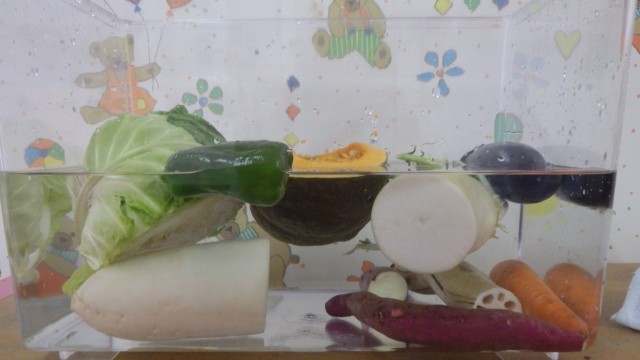 最後に、野菜を水の中に入れると浮くのか沈むのかを実験してみました。「半分に切ったさつまいもは浮くと思うけど、一本丸ごとでは沈むと思う!」などと言い、楽しく予想をしていました。土の中で育つ野菜は沈み、土の外で育った野菜は水に浮くことを伝えると、「さつまいもは土の中から出てきたもんね」「大根の上の部分は、土の外に出ているから浮くんだ!」と発見していました。