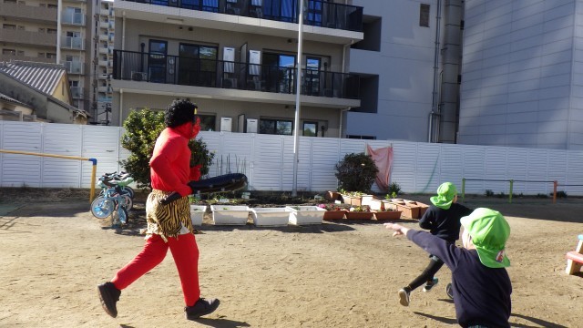 「夜ゲームをして寝るのが遅くなる”ゲーム鬼”や!」「友達と喧嘩しちゃう”おこりんぼう鬼”」など、子どもたちは自分の中にいる鬼のお話をしていました。園庭に出ると、赤鬼発見!子どもたちは勢いよく「おには~そと!」「ふくは~うち!」とみんなで力を合わせていましたよ。怖くて泣いちゃう3歳児もいましたが、鬼がいつも優しい教職員だと分かり、ほっと一安心。