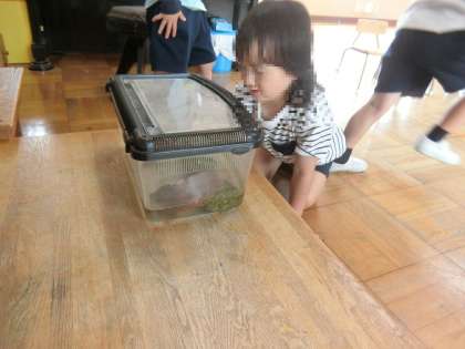 登園すると、ザリガニがいつもと違うことに気付いた子どもたち。