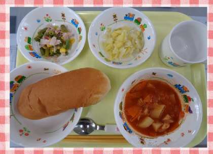 16日の給食のメニューは「ケチャップ煮」「ベーコンとサンドマメのソテー」「キャベツのサラダ」でした。