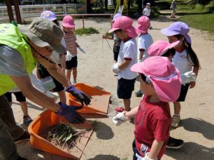 公園では、管理をしてくださっている地域の方が出迎えて下さり、玉造公園についてお話をしてくださいました。いつも遊んでいる玉造公園にありがとうの気持ちも込めて、みんなでゴミ拾いをしました。ピカピカになって子どもたちもいい気持ち♪