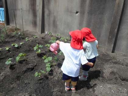 これからも登降園時に保護者の方と一緒に水やりをしていただき、生長を喜び、野菜ができることを楽しみにできたらいいなと思っています。