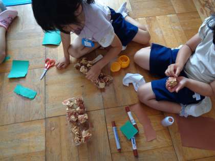 年長ゆり組のお友達が「たこ焼き」をつくって遊んでいました。午後から一人で遊びの続きをしていると、年中さくら組のお友達が一人、「一緒につくりたい」と、ゆり組のお部屋にやってきました。「ここにのりをつけるのをできる?」と年長さんが優しく声をかけ、年中さんもたこ焼きの青のりを付けるのを楽しんでいましたよ。
