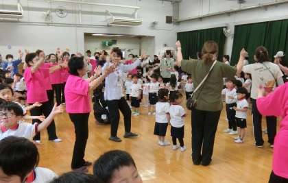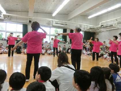 地域の女性会の方にお越しいただき、「ドンパン節」「炭坑節」を教えていただきました。そして、園児からも「おだんご ころころおんど」を紹介しました。保護者の方もたくさん来てくださり、みんなで輪になって踊りました。