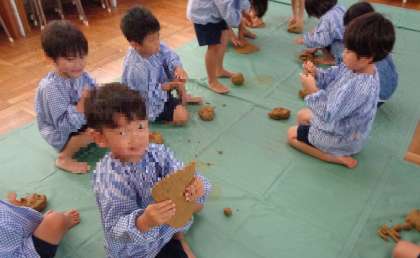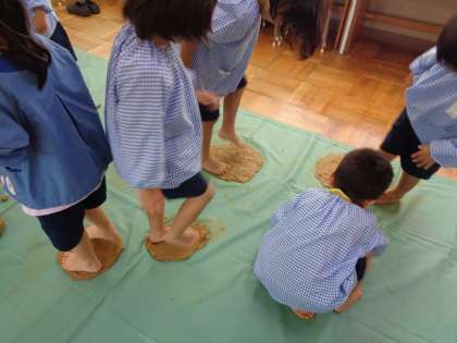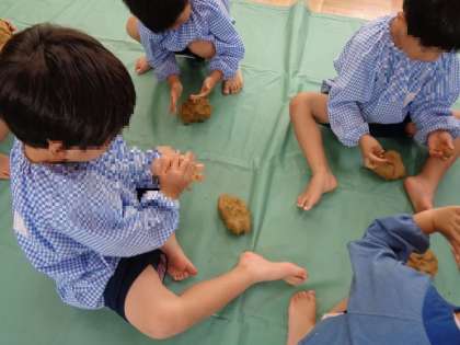 初めて見る土粘土に子どもたちは興味津々!思わず匂いを嗅いでみると、「土の匂い…?」と不思議な様子。ころころ丸めてお団子を作ったり、細くしてどんどん長くしてみたり、足で踏んでみたり…感触を楽しみながらいろいろな遊び方を見つけていました♪