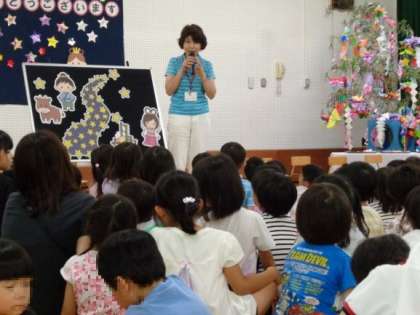 園長先生からのプレゼントは七夕のお供え物についてのお話。七夕が楽しみになりましたね♪