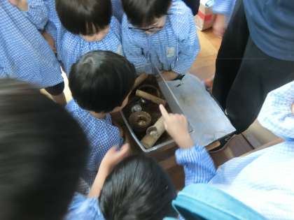 長い間土の中で眠っていたカブトムシの幼虫が成虫になって出てきて、今はゆり組のお部屋で過ごしています!恥ずかしがり屋さんなのか、土の中に隠れていることも多い3匹のカブトムシ。ふじ組の子どもたちも興味をもって見ています。