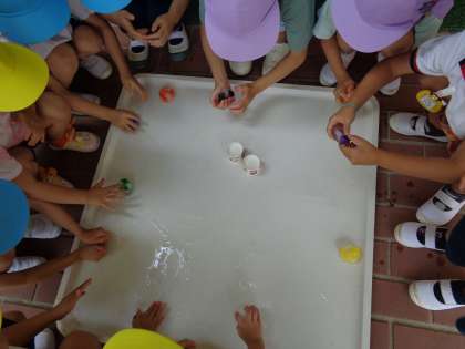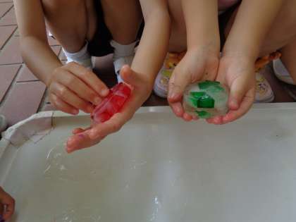 触っていると少しずつ氷が溶けていき、おもちゃが取れます。すぐに取れそうで取れないし、ずーっと触っていると手が冷たくなります。「冷たいー」と冷たくなった手を顔や体に当て「気持ちいい〜」と、氷に触れる楽しさを感じながら、テラスで涼しい時間を過ごしました。