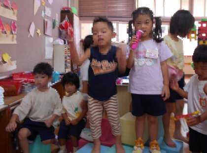 暑い日が続き、園庭に出ることがなかなかできませんが、2号認定児のにこにこ保育では保育室で遊びを工夫して楽しんでいます。