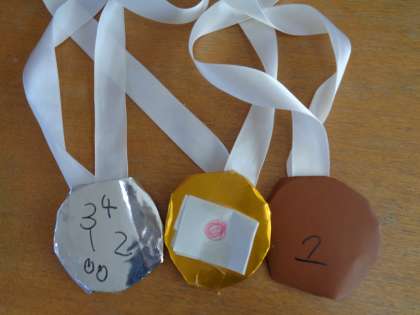 その後、4・5歳児で遊んでいると、ソフト積み木を使いながらオリンピックごっこが始まりました。「スケートボードしてるねん」「うまかったら金メダルもらえるねんで」「えっ!メダル欲しいなあ」という会話から、みんなでメダルをつくりました。夢中になって遊んでいると、あっという間に給食の時間に…。「まだまだしたい!」と、すっかりオリンピック選手になりきる子どもたちでした。