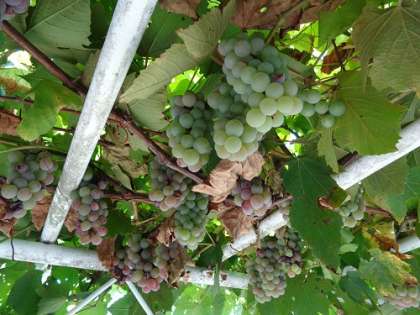 ブドウもたくさん実がなっていますよ。近くに行くとブドウの甘い香りがしていました。もうすぐ色付きそうです。