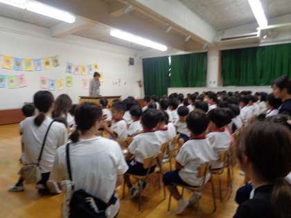 始業式では、園長先生の「夏休み元気に過ごせましたか?」「お手伝いしましたか?」の質問に元気よく「はーい!」と大きな声で答えていました。保育室や廊下では、「聞いて!聞いて!」といろいろな先生に、夏休みに楽しかったことを知らせる姿がたくさんありました。