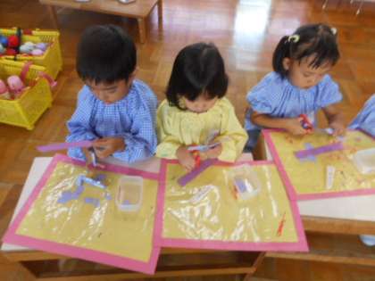 「これは甘いぶどうだよ」「これは種があるの」と思い思いに考えながら嬉しそうにぶどうをつくっていましたよ。2学期になり初めてはさみを使った製作を行ったので、はさみの正しい持ち方やはさみを使うときの約束などを思い出すことができるように言葉かけを行いました。どの子どもも約束を守って、安全にはさみを使うことが出来ていましたよ。