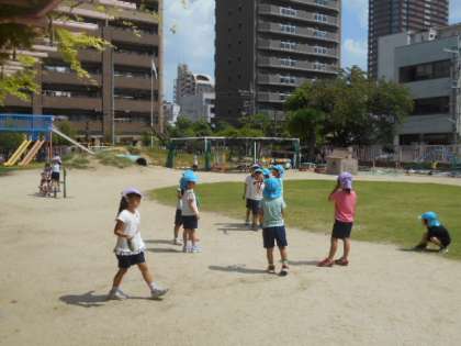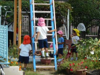 芝生では虫網片手にトンボを追いかけたり、久しぶりに滑り台に登ったり、真夏の間出来なかった園庭での遊びを楽しんでいます。まだまだ限られた時間ではありますが、遊べる時には園庭で楽しく過ごしたいと思います。