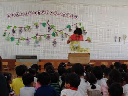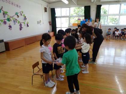 園長先生からのプレゼントは「ギンヤンマのヤン」のお話でした。また、もも組さんからのプレゼントは、息を吹くとトンボが飛んでいく手作りおもちゃでした。園庭を見るとトンボが沢山飛んでおり、今の季節にピッタリなプレゼントでしたね。