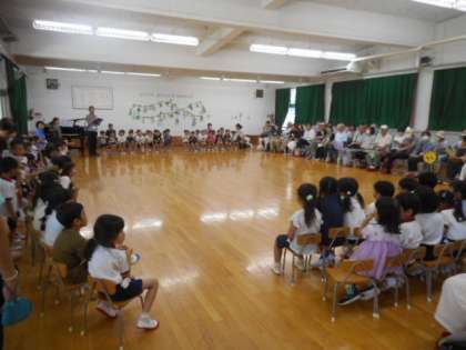保育室でたくさん遊んだ後は、遊戯室に全クラスの子どもたちと おじいさま おばあさま が集まりました。