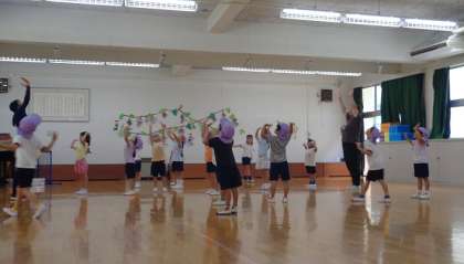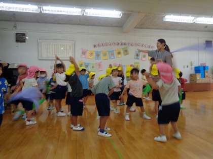 運動会に向けて様々な活動をしています。体操をしたり、身近な動植物になって遊んだり、運動遊具で遊んだり、クラス対抗で遊んで作戦会議をしたりしています。遊びの楽しさはそれぞれの学年によって違うようです。どの子どもたちも体を動かして遊ぶことが大好きで、目がキラキラさせて楽しんでいます。年長児の活動では、時には思いがぶつかることもありますが、その都度思いを聞きあって、心を一つにしようとする姿も見られます。